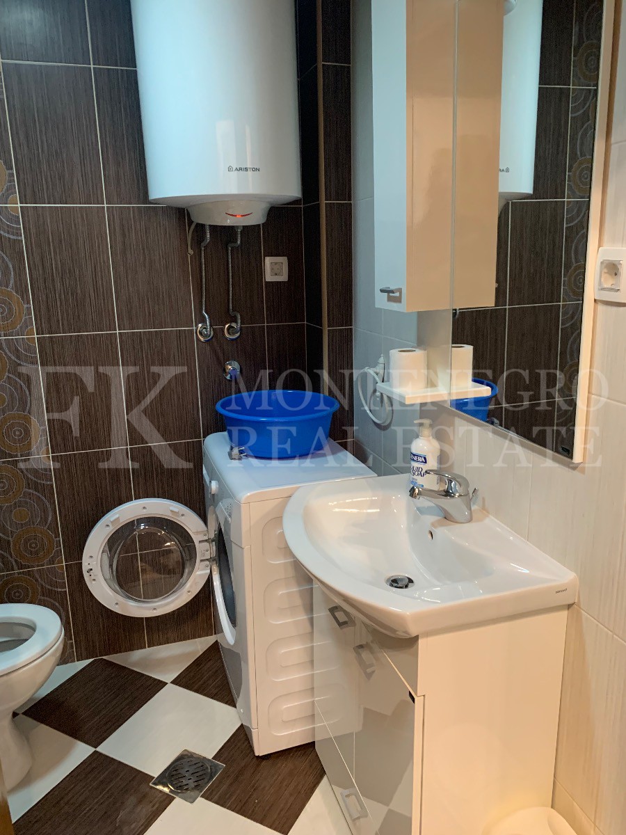 The apartment is sold with high-quality furniture and consists of a large, bright living room with a dining area, access to the balcony, stunning sea views, a kitchen (not fully equipped), one bedroom with a balcony, a bathroom with a shower, toilet, sink, and washing machine.