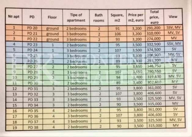The price per m2 ranges from 3200 to 3800 euros depending on the floor and view.