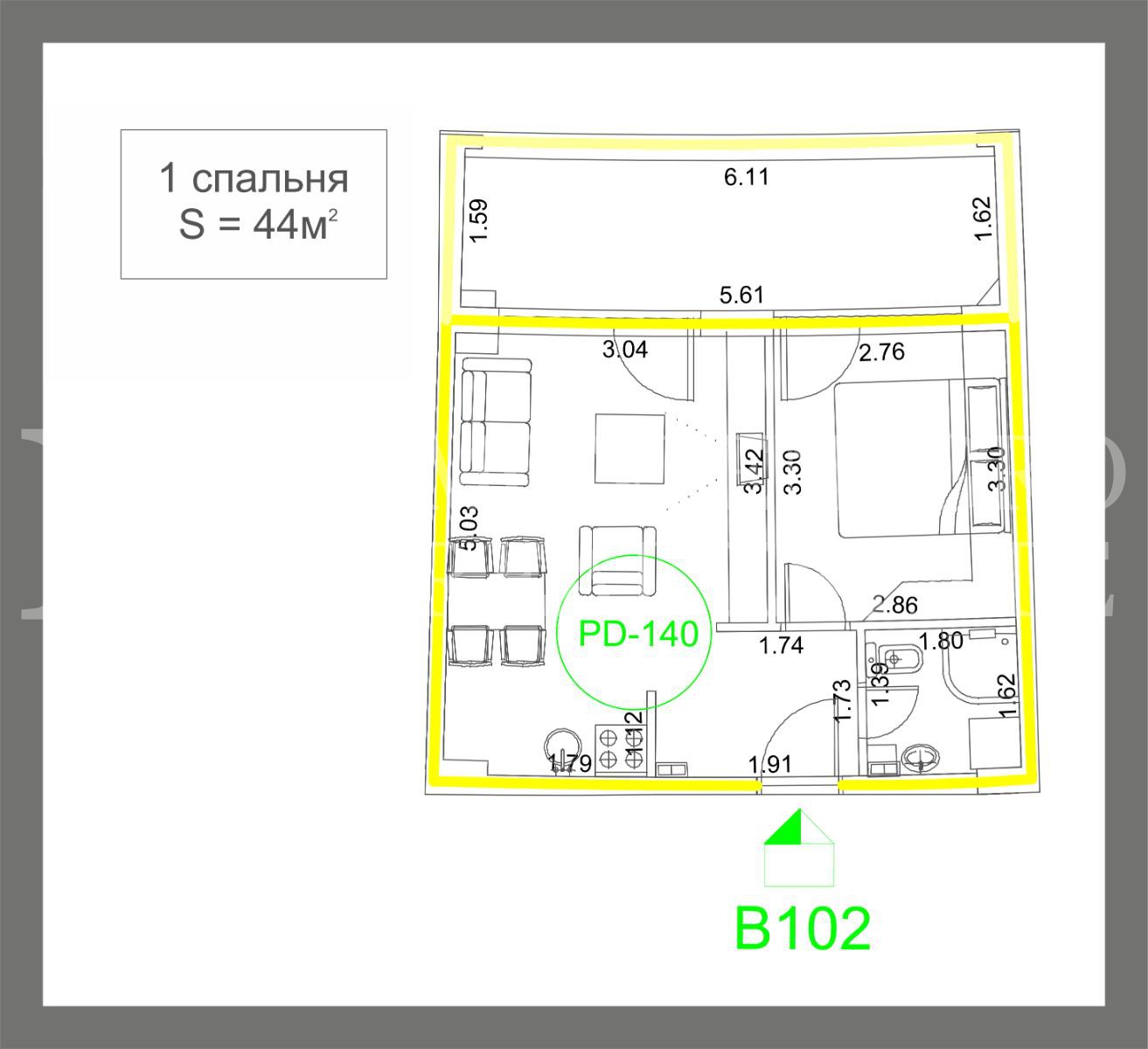 It consists of one bedroom, big living room with an open plan kitchen, bathroom and a big balcony with a sea view.