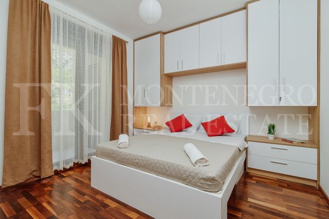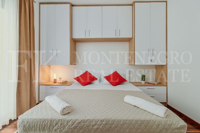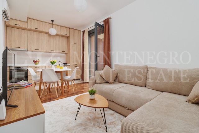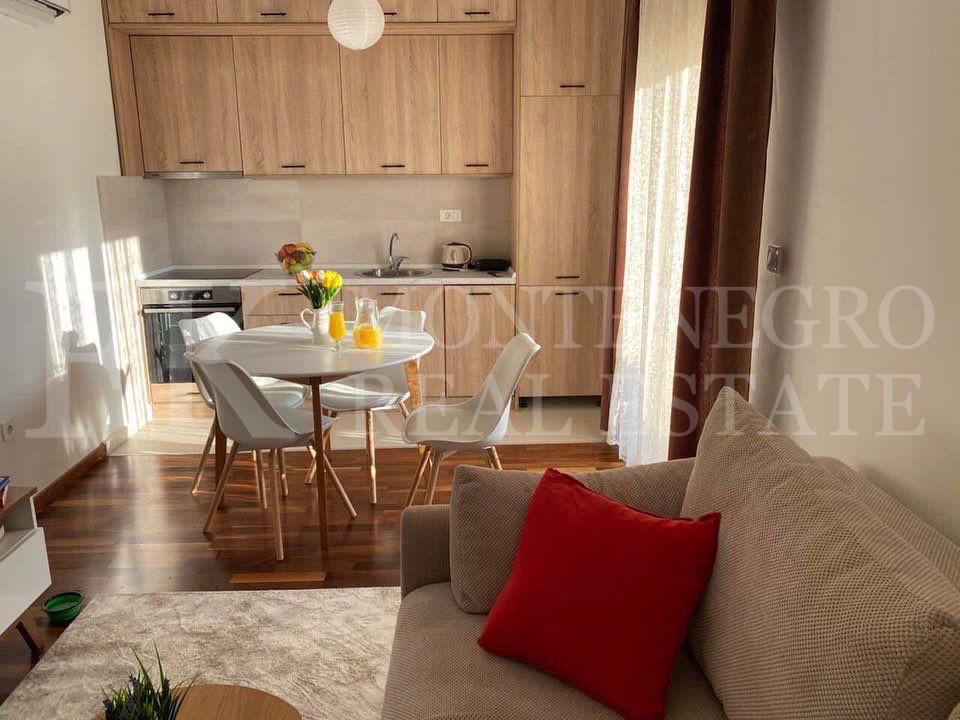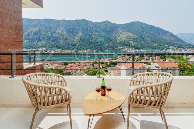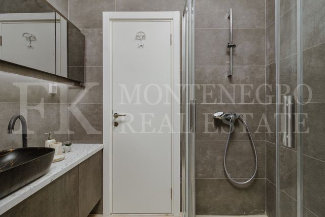 This elegant 50 m² apartment is located on the fourth floor of a modern building in Kotor-Dobrota, offering a stunning view of the Bay of Kotor.
