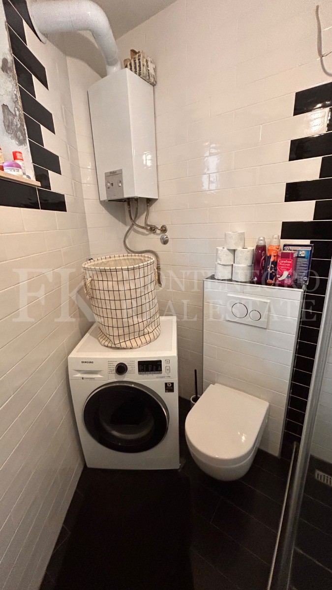From the entrance, you access the kitchen on the right and the bright bathroom on the left, equipped with a washbasin, shower, WC and washing machine.