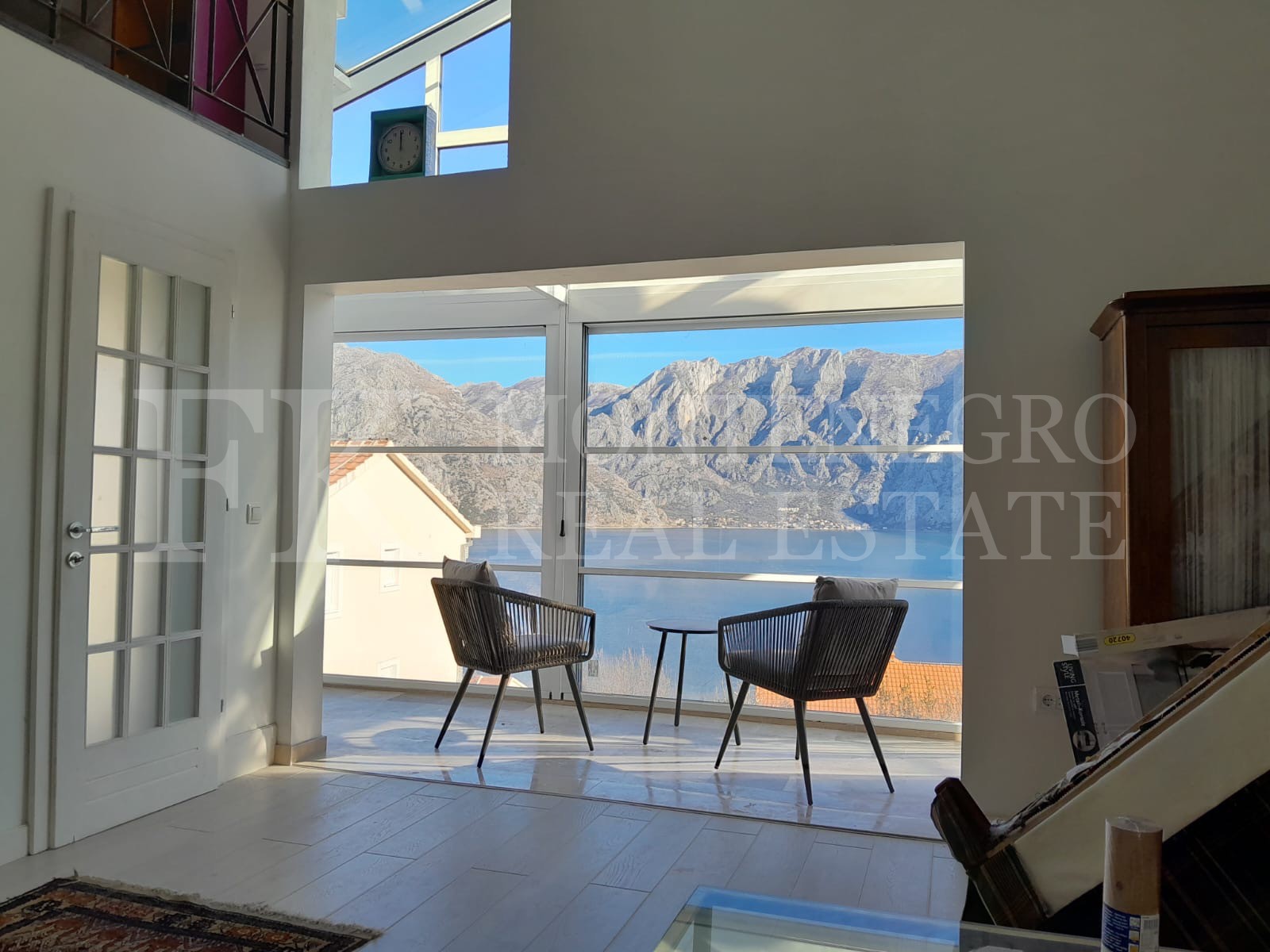 This newly built house with 143 sqm and an additional guesthouse (51 sqm) offers a prime location, just 330 meters from the coast, with an impressive panoramic view of the Bay of Kotor and the surrounding mountains.
